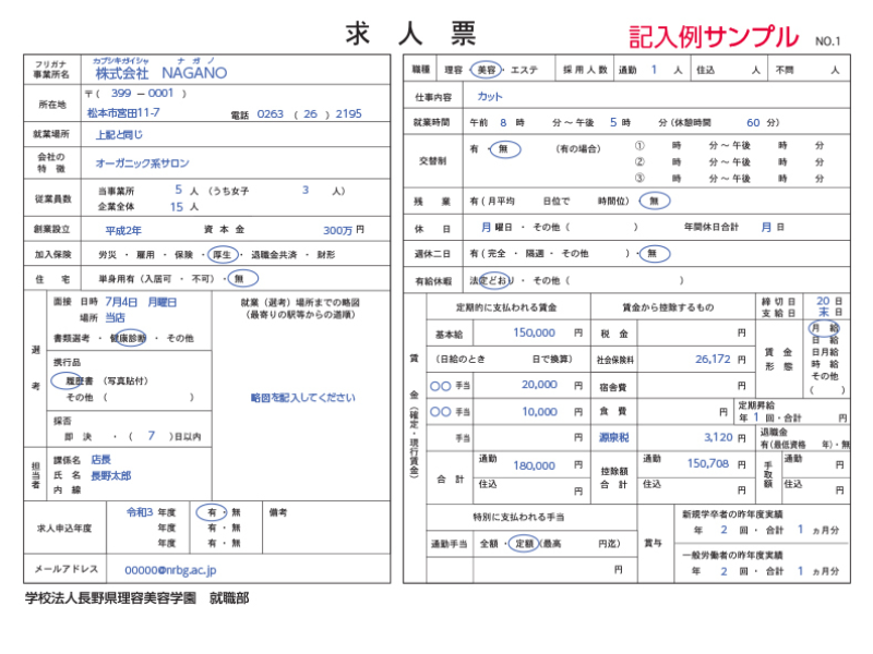 宛先:〒380-0935 長野市中御所3-11-2 長野理容美容専門学校 就職部宛
